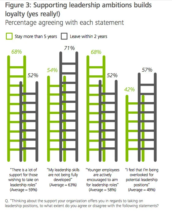 I've seen an increasing number of young employees unsatisfied with their current position who see themselves job hopping every 3-5 years . This is quite different from when I started my career. We would stay at the same company for years (even decades!) All we aspired to, were promotions and salary increases. In their Millennials survey, Deloitte tries to understand why "Two in Three Millennials expect to leave [their company] by 2020". According to them, young workers look for a high overall employee satisfaction and relationship with their manager first, followed by the company's ethics and attention to customer care. When comparing loyal & "un-loyal" millennials, they found that companies with strong leadership development programs tend to retain better. The chart below shows how: